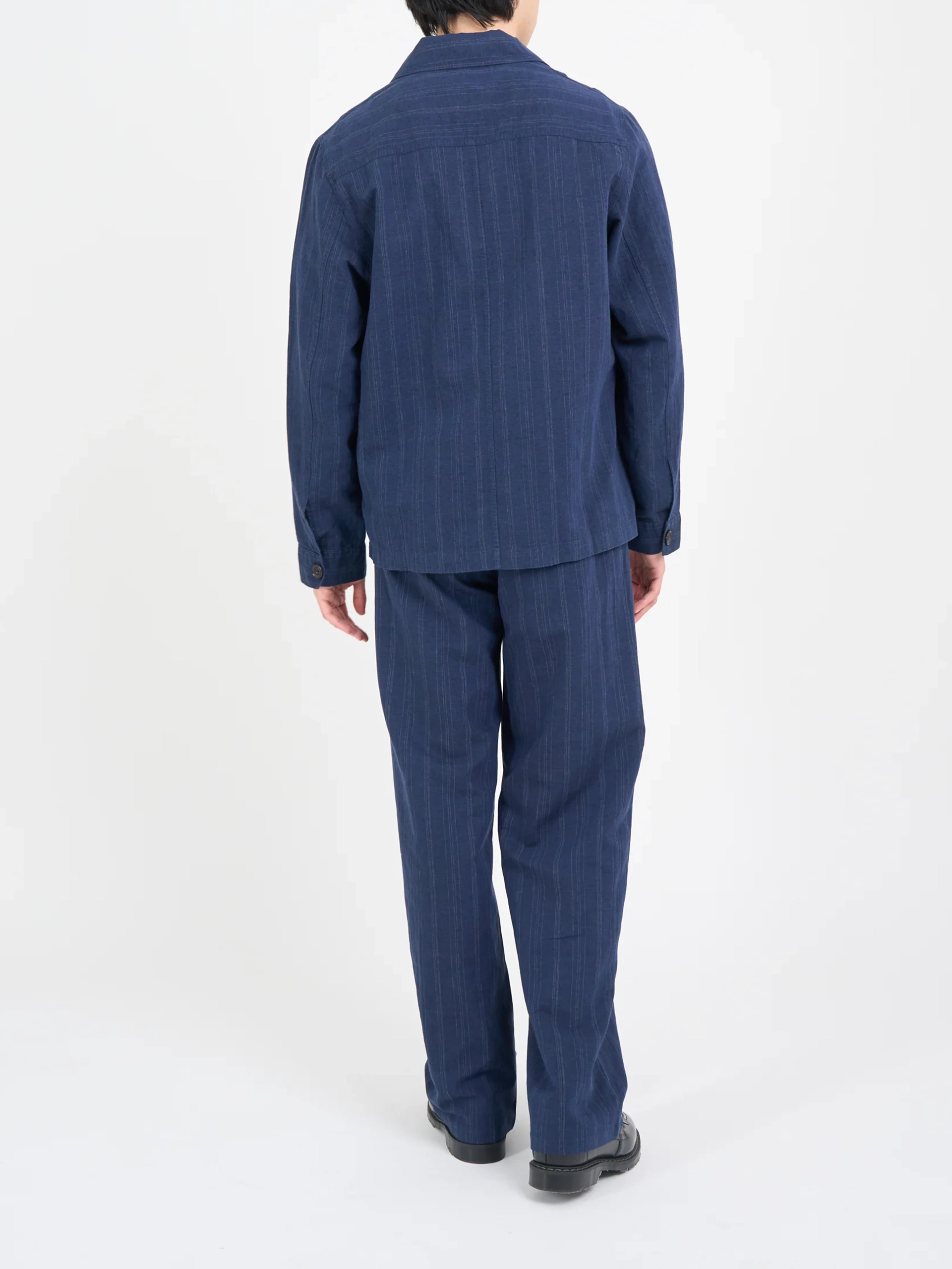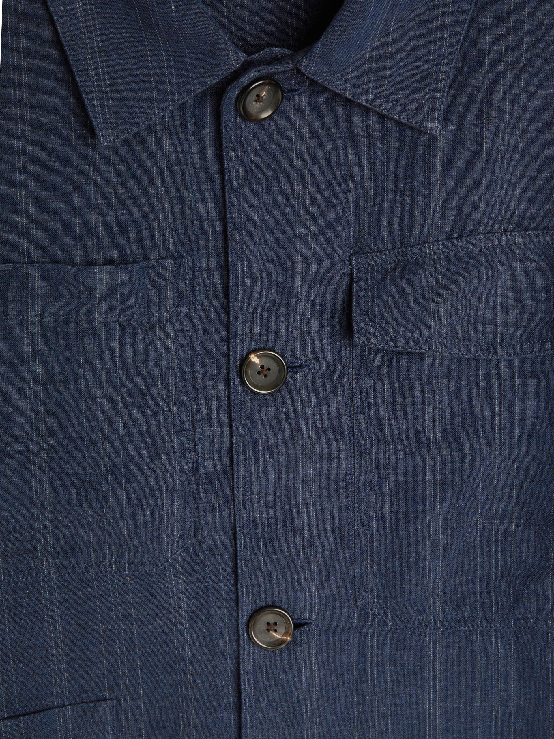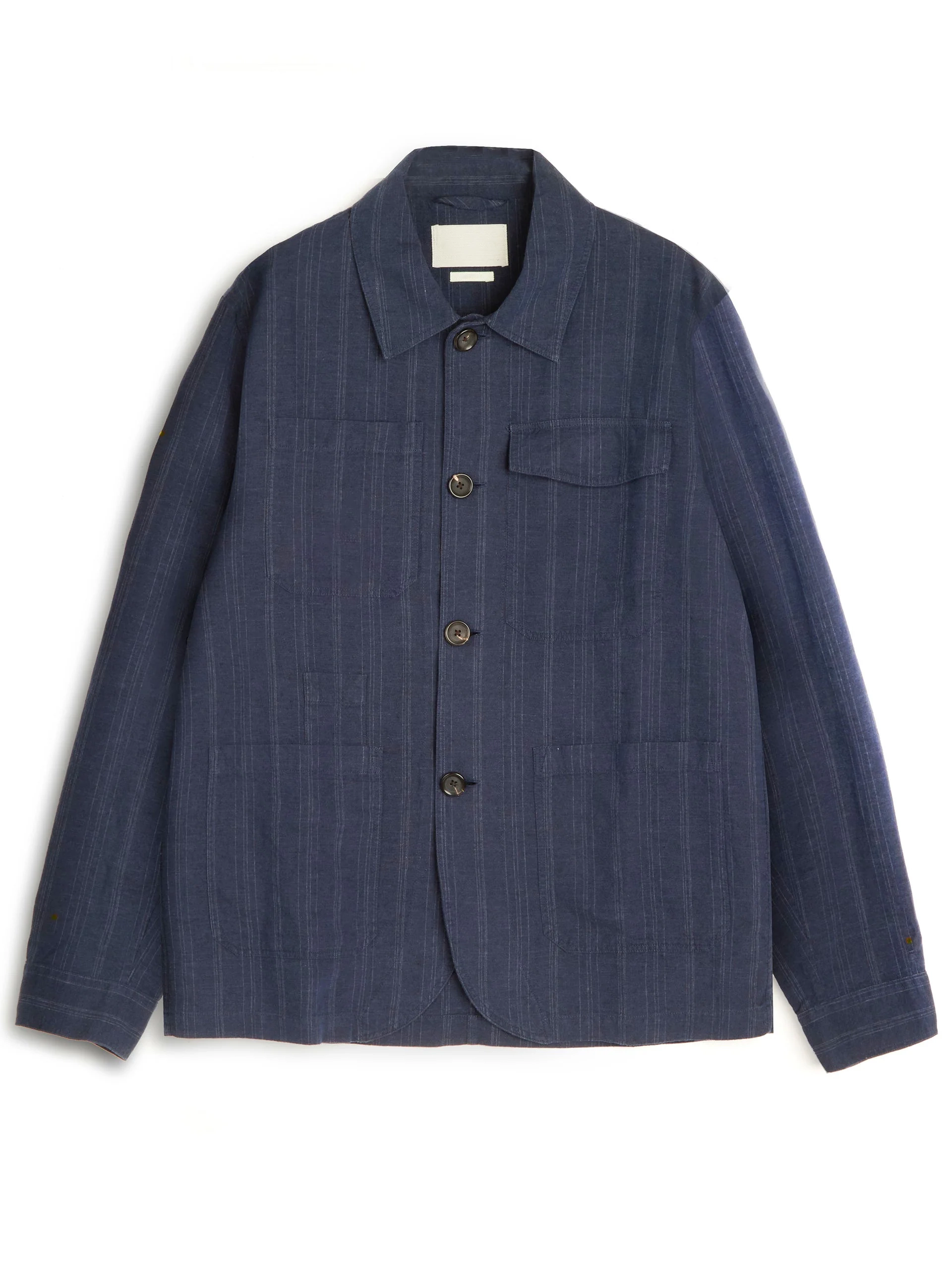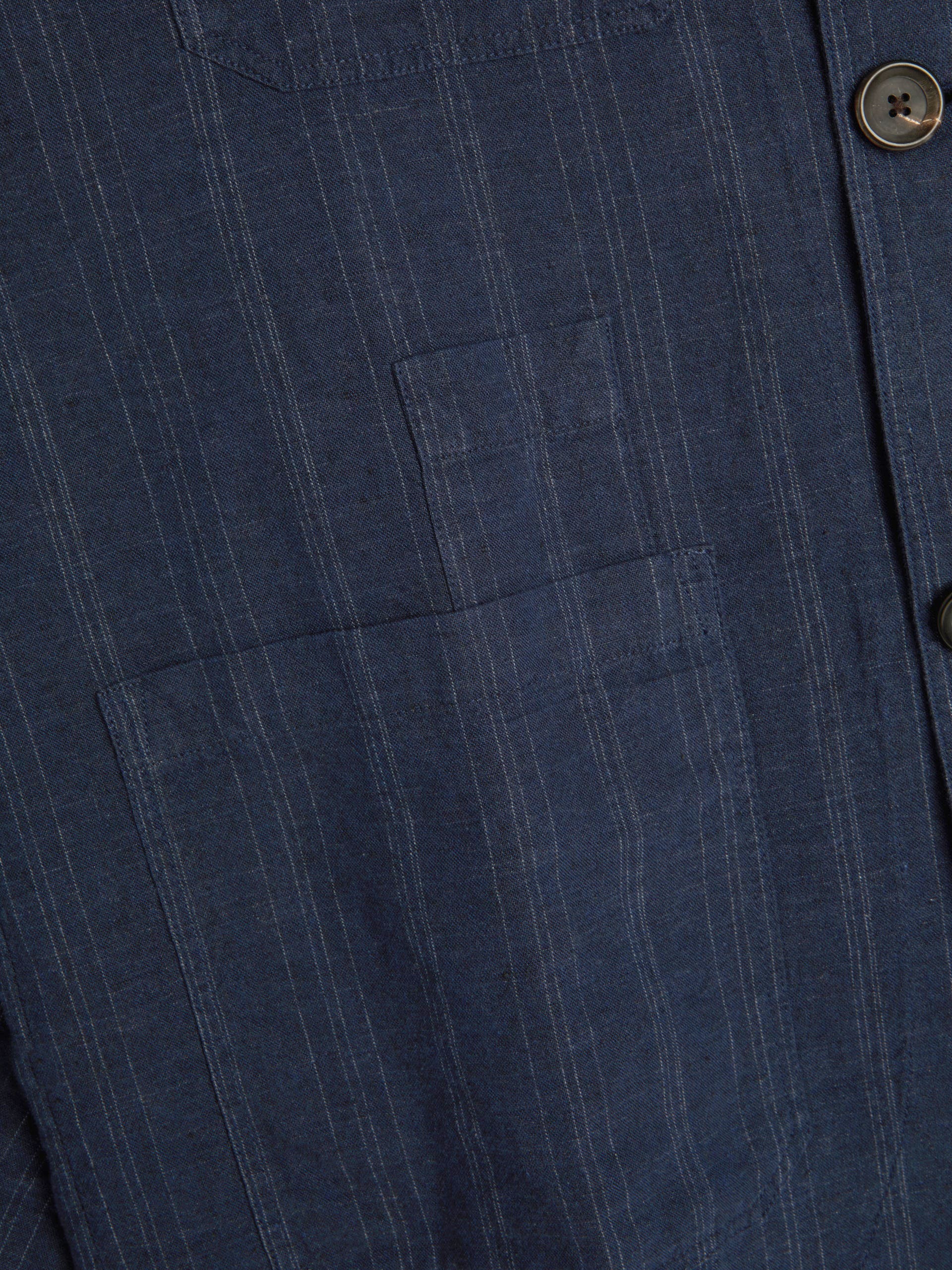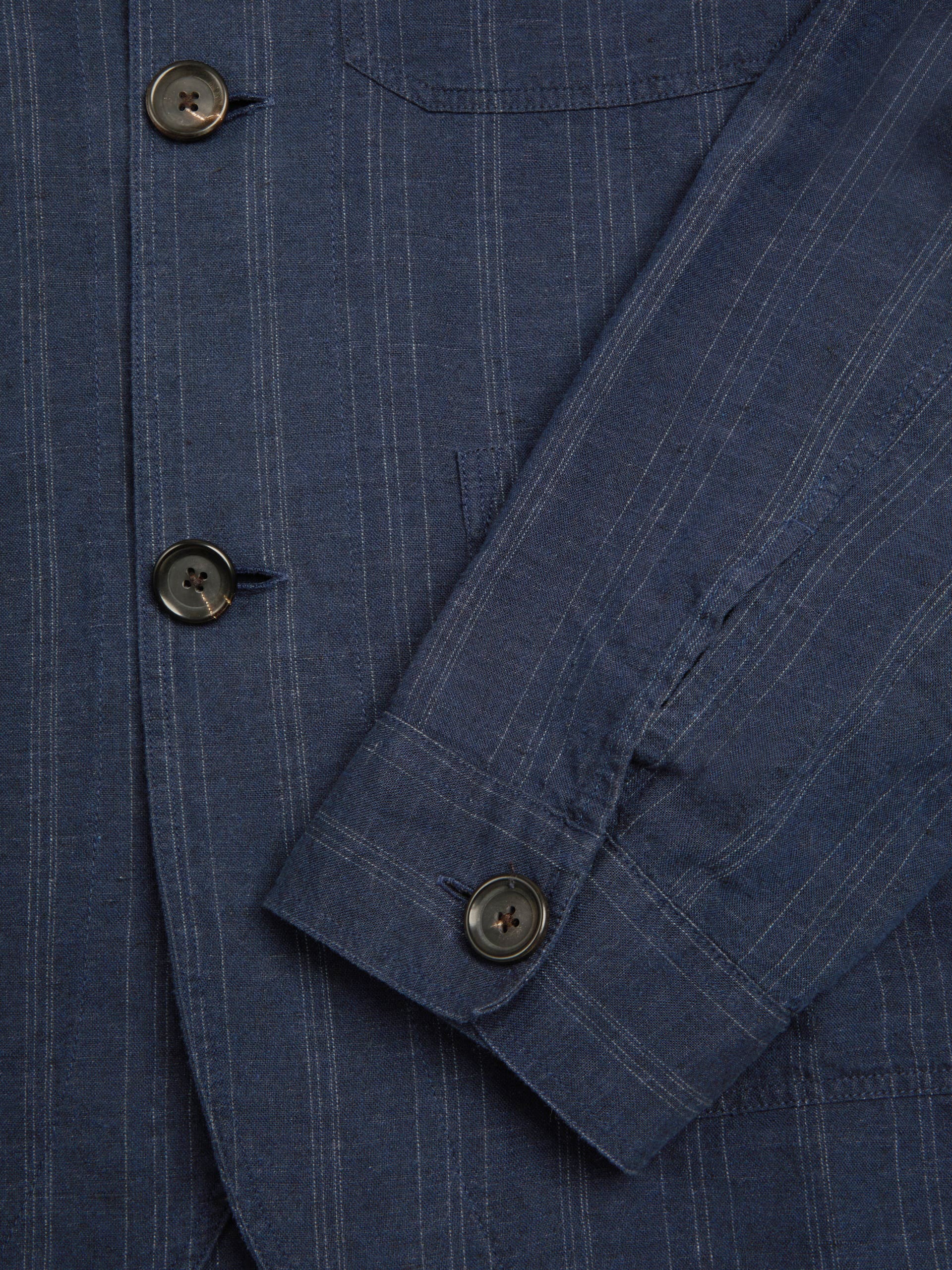 The jacket is a modern iteration of the chore jacket. This style has been constructed from a beautifully soft blue cotton and linen fabric. Functionality comes via four front patch pockets, two rear patch pockets, and a pen pocket.