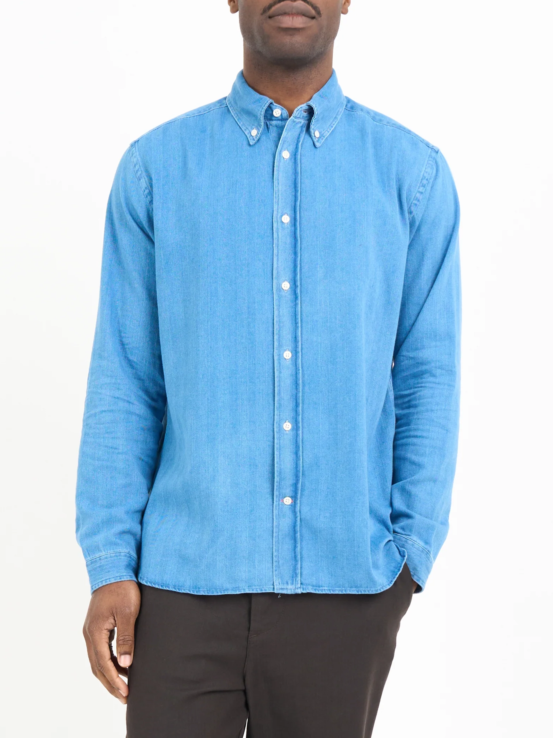 The shirt is a timeless button-down collar shirt for those preppy smart-casual looks. This style has been beautifully made using a midweight indigo-dyed cotton with a herringbone weave.