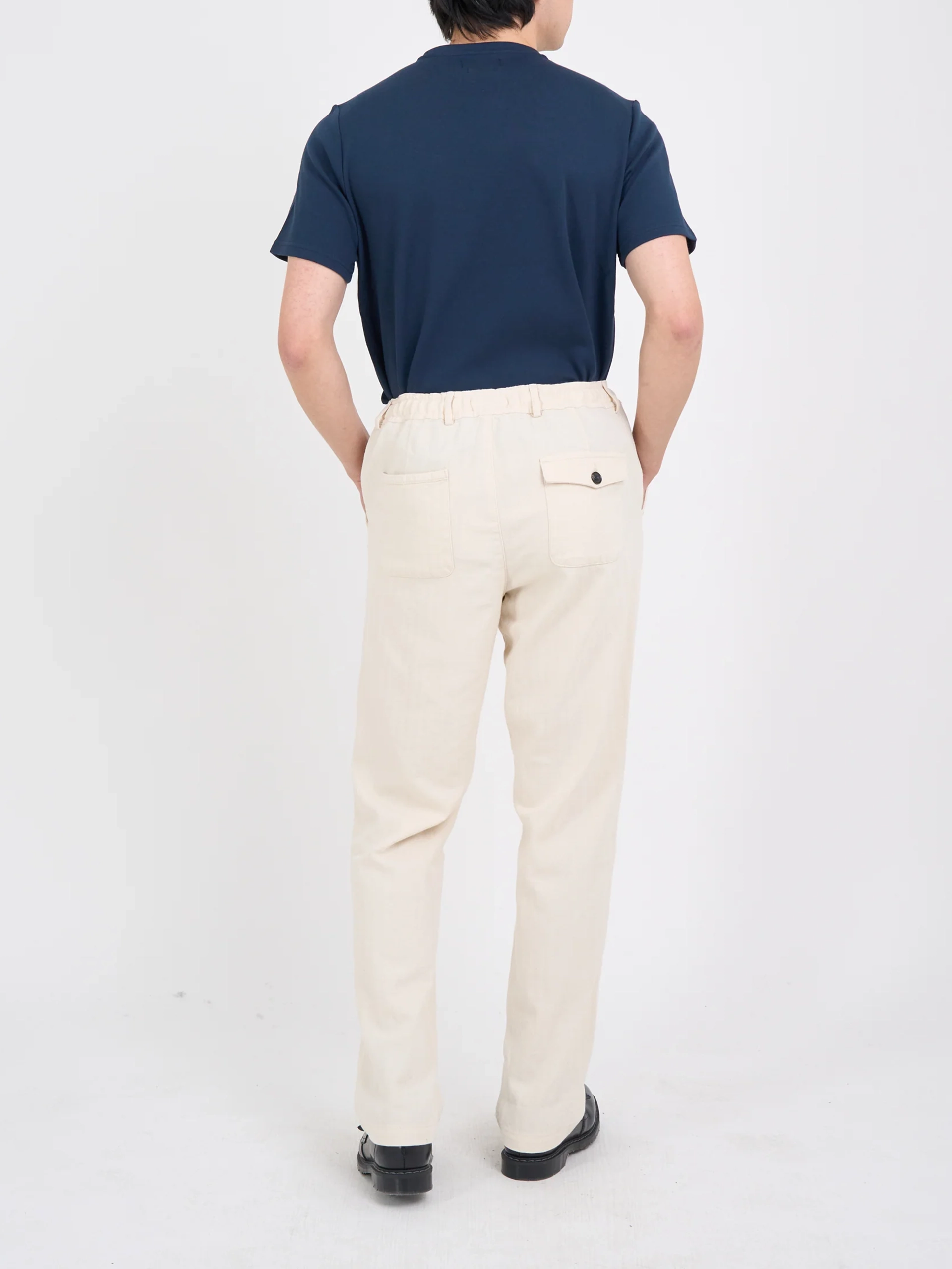 The drawstring trouser is a relaxed style cut straight through the leg with two back pockets, a cotton drawstring through the waistband and a button fly. For this version, which can be worn as part of a suit, or separates,