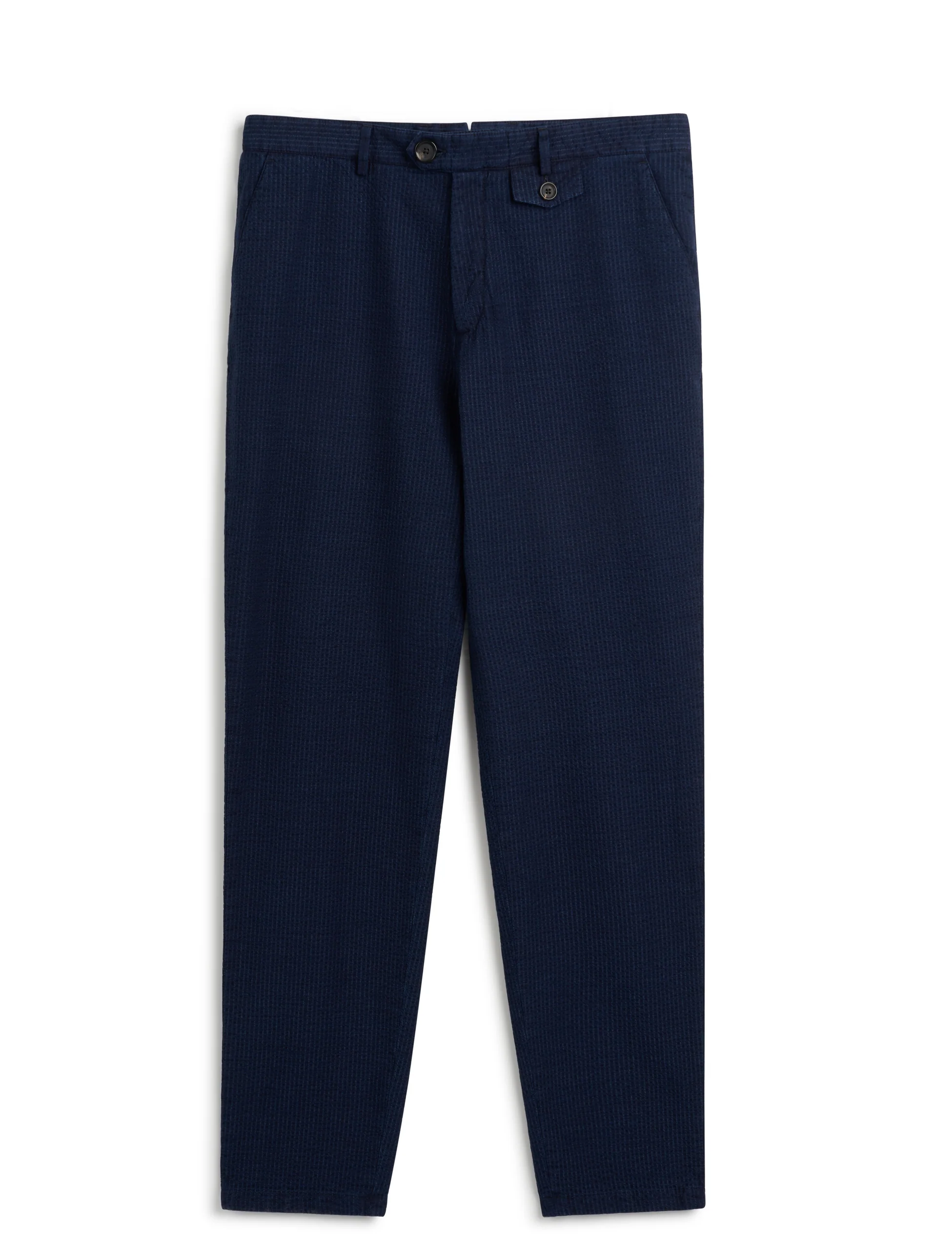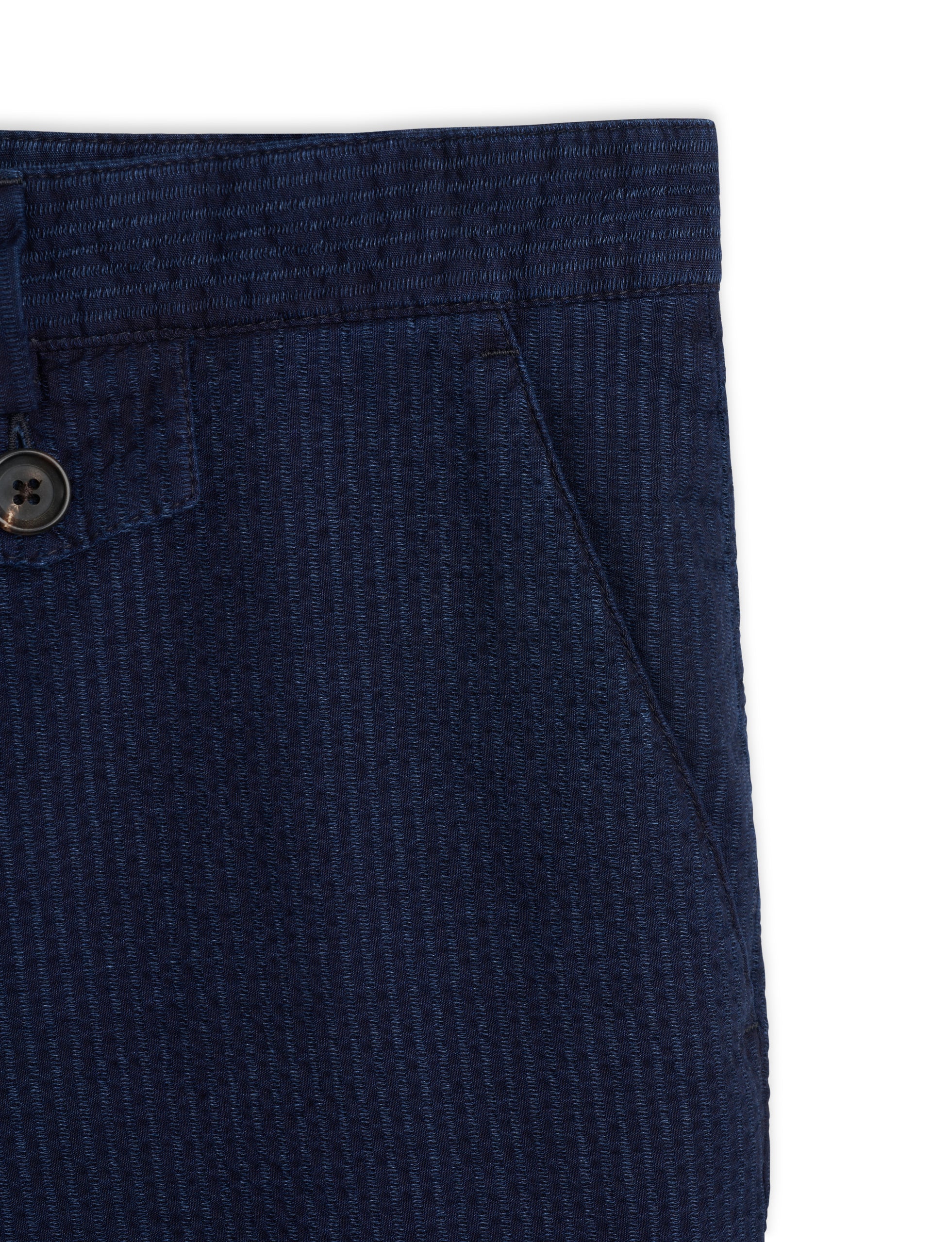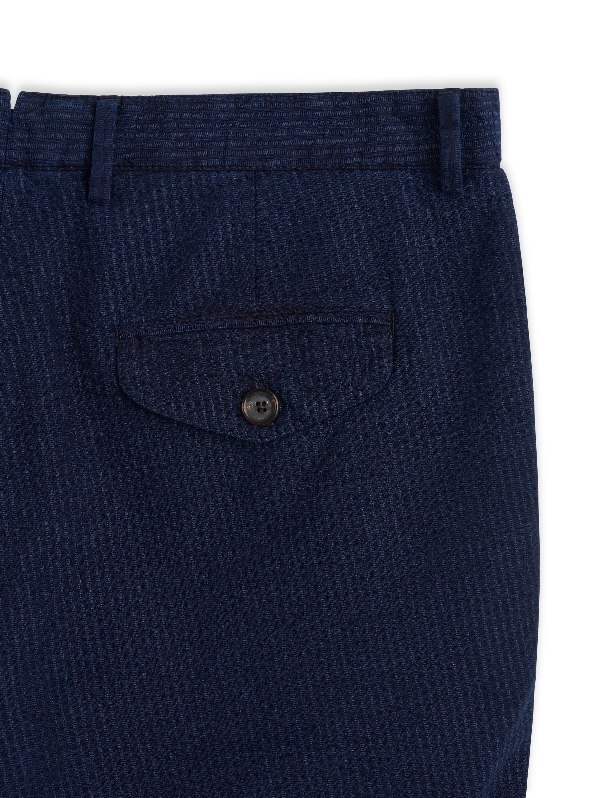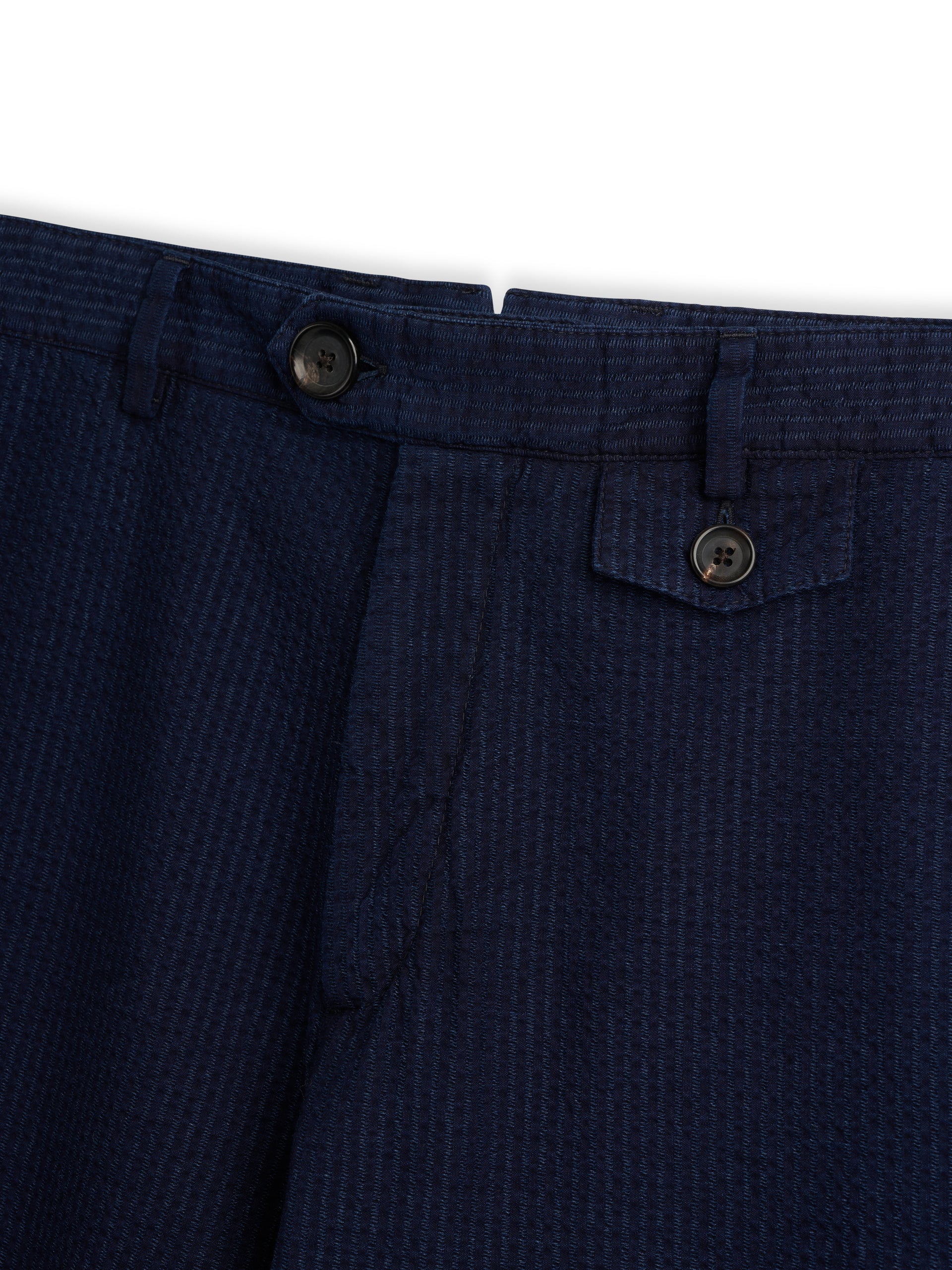 These trousers are so-called because of the v-shaped cut in the rear of the waistband, which is a reference to classic men's trousers that had room for buttons for braces. This style is crafted from a lightweight indigo-dyed cotton seersucker fabric 。
