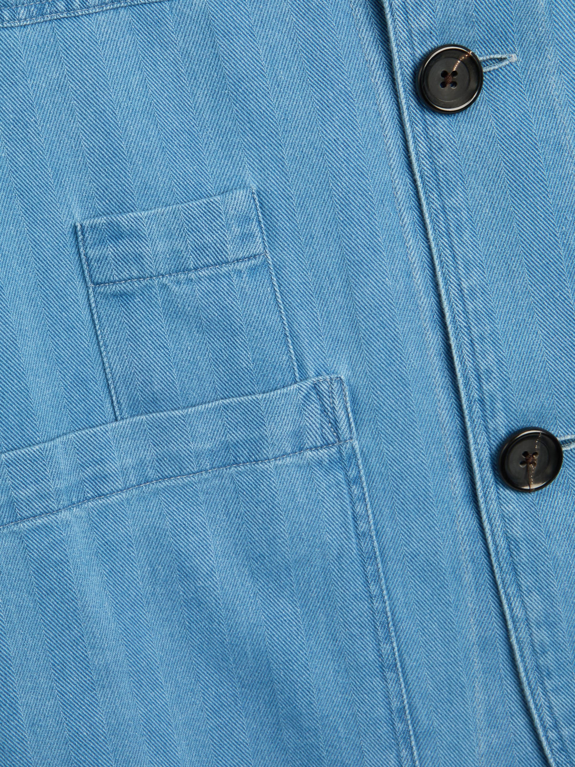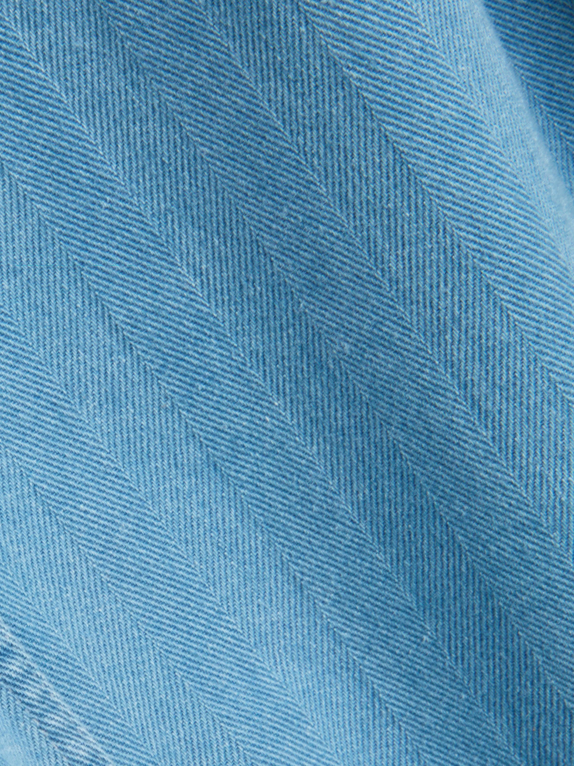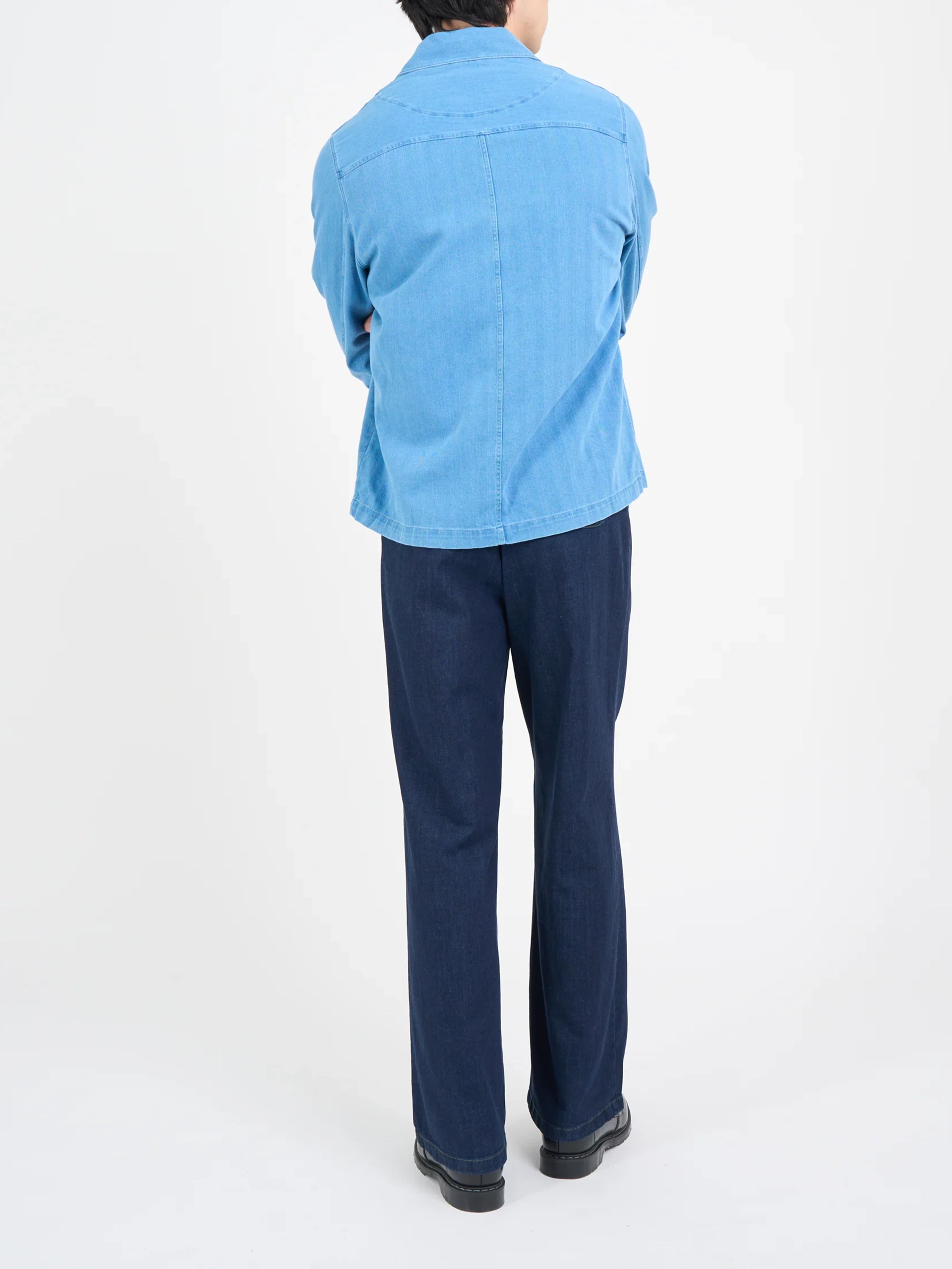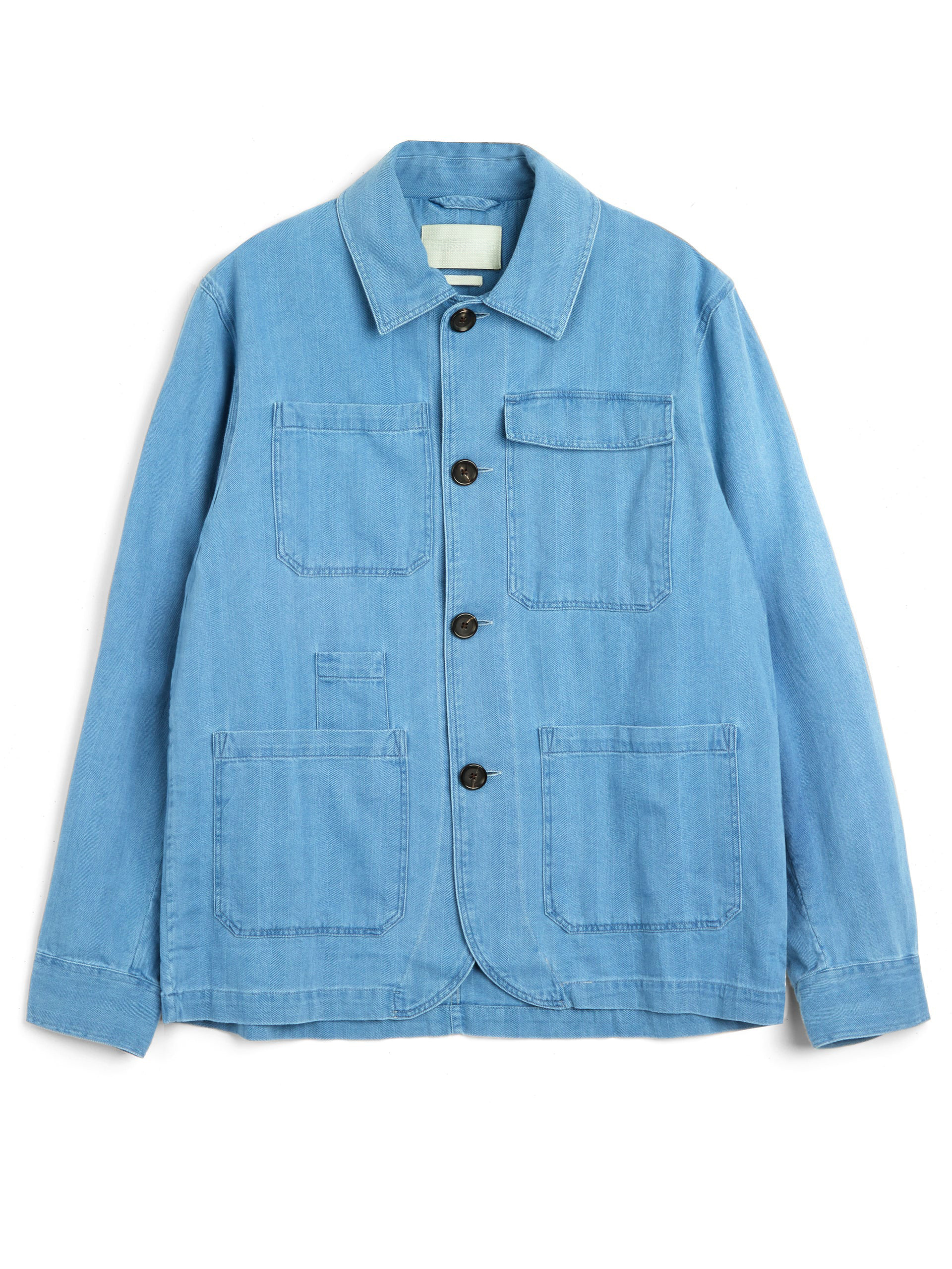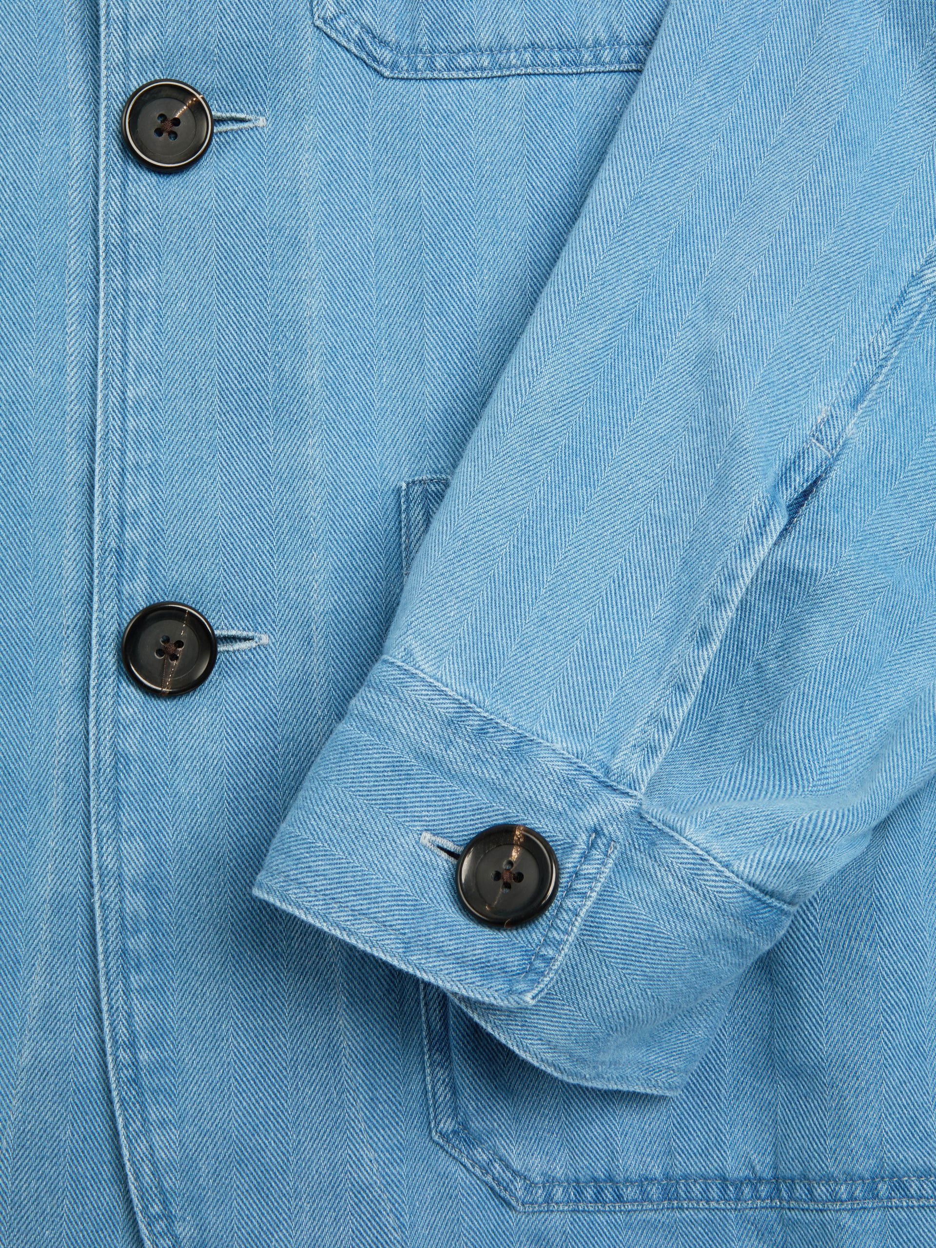 The jacket is a modern iteration of the chore jacket. This style has been constructed from a beautifully soft blue cotton and linen fabric. Functionality comes via four front patch pockets, two rear patch pockets, and a pen pocket.