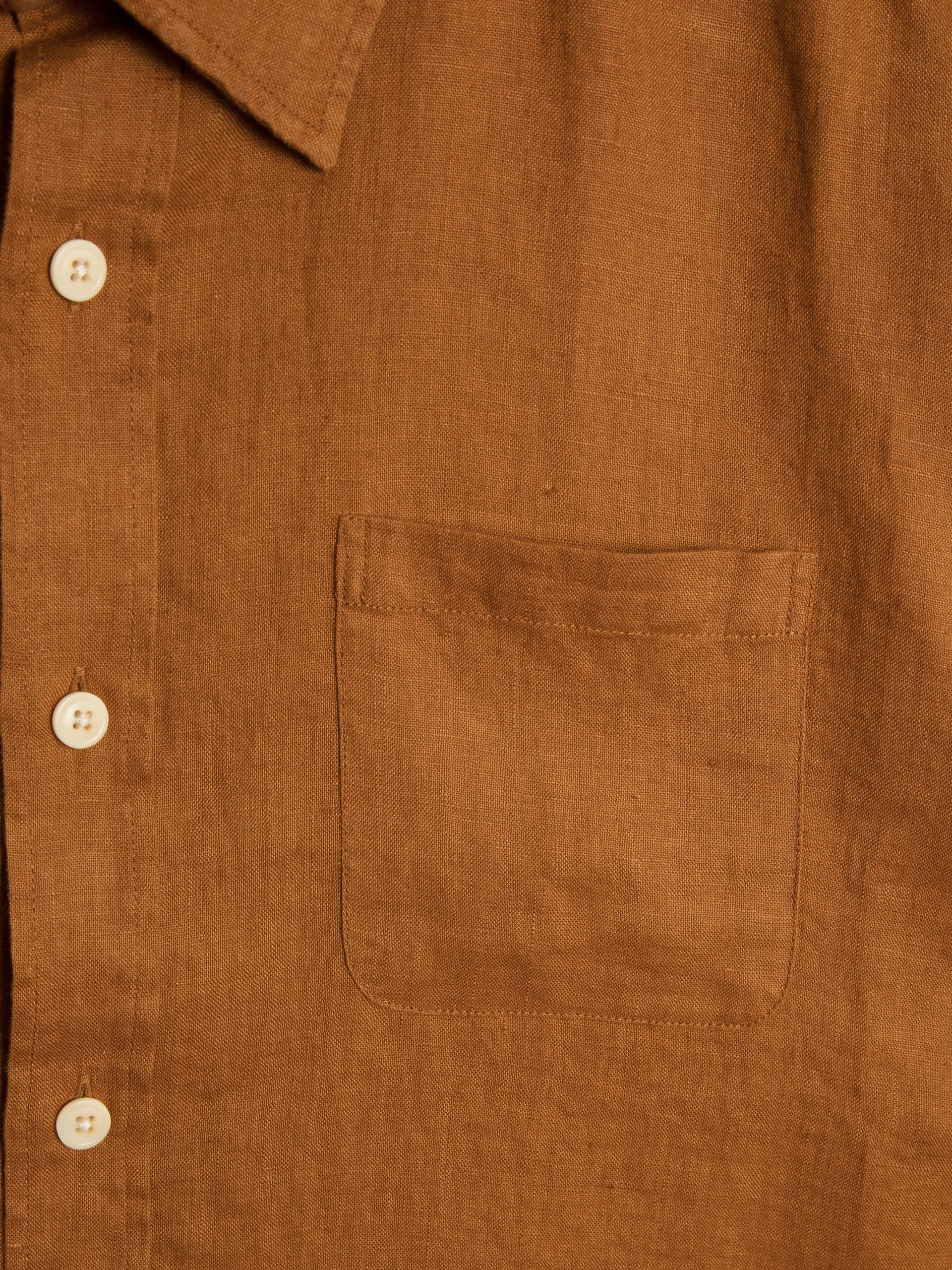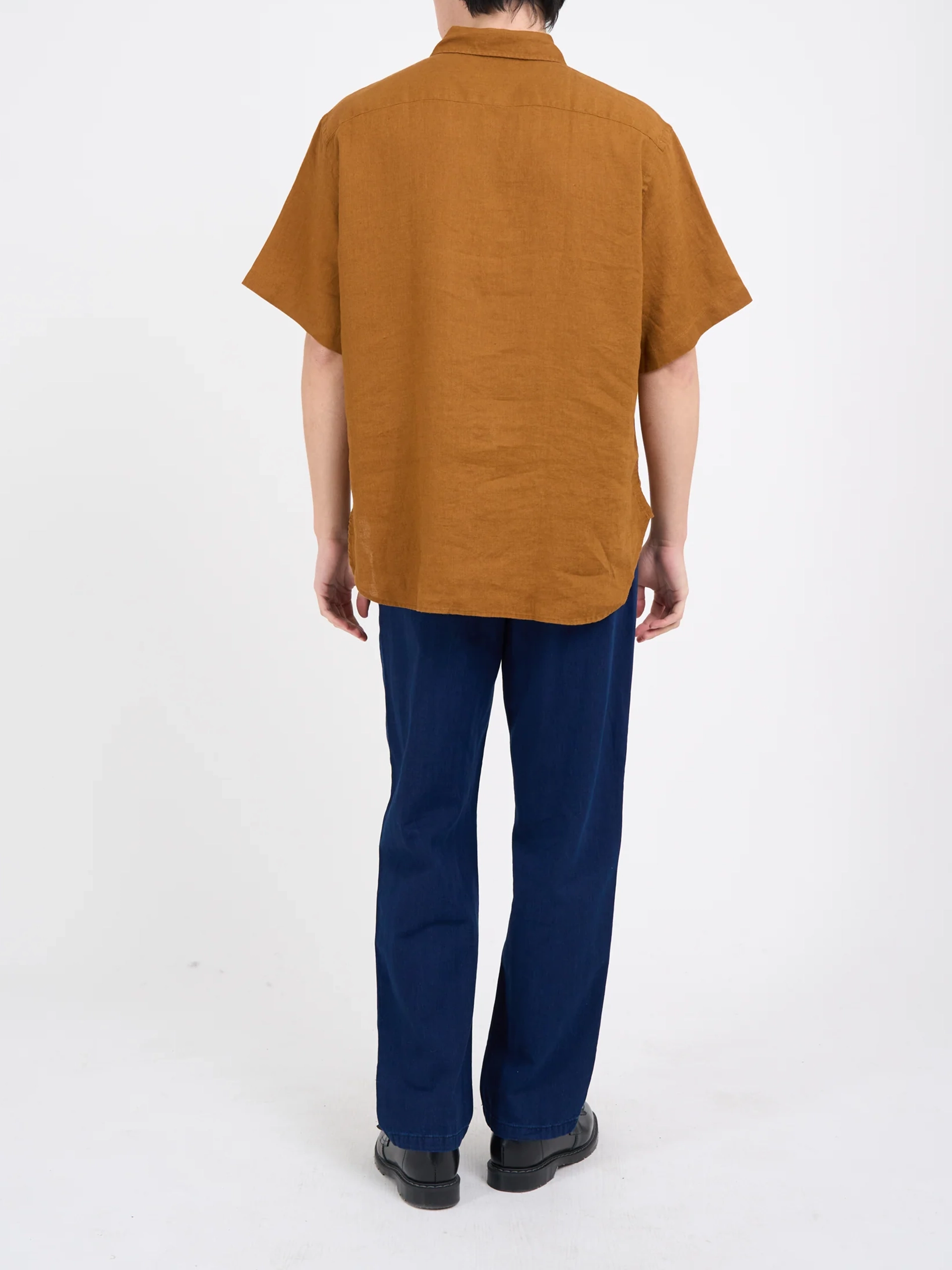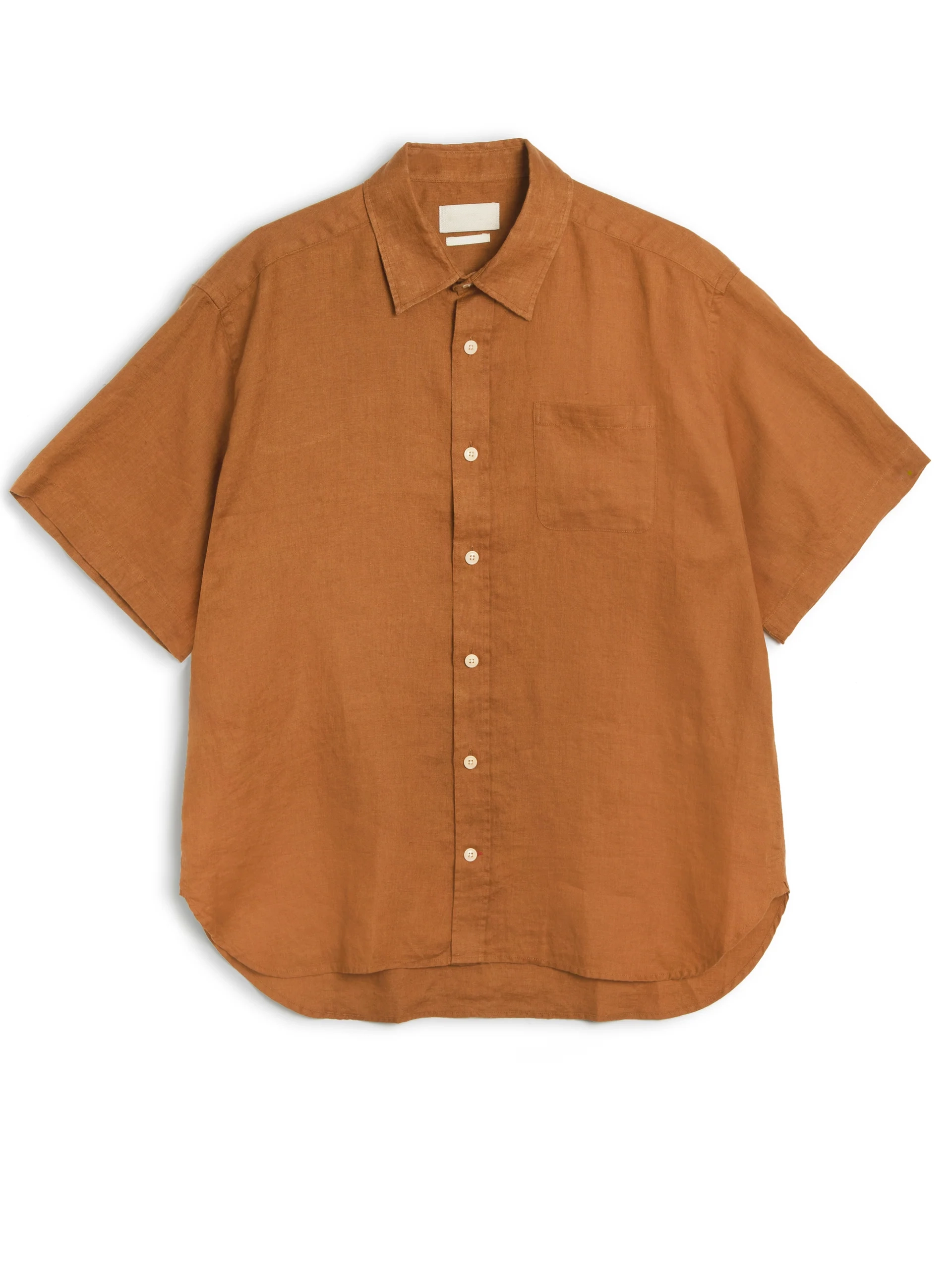 The  short-sleeve shirt is a new style for this season, featuring an oversized fit with a spear collar and front patch pocket. This version is crafted from a lightweight linen fabric, perfect for spring and summer wardrobes.
