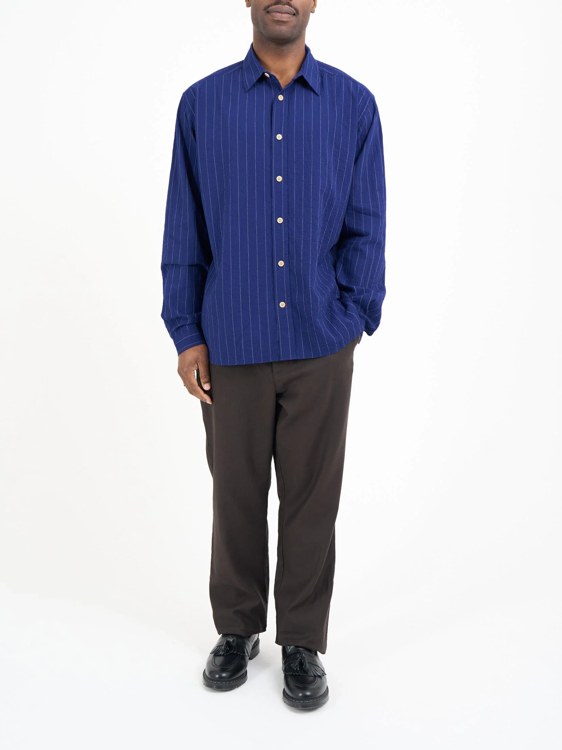 The long-sleeve shirt is a new style for this season, featuring an oversized fit with a spear collar and front patch pocket. This version is crafted from a lightweight 100% cotton fabric with a stripe deta