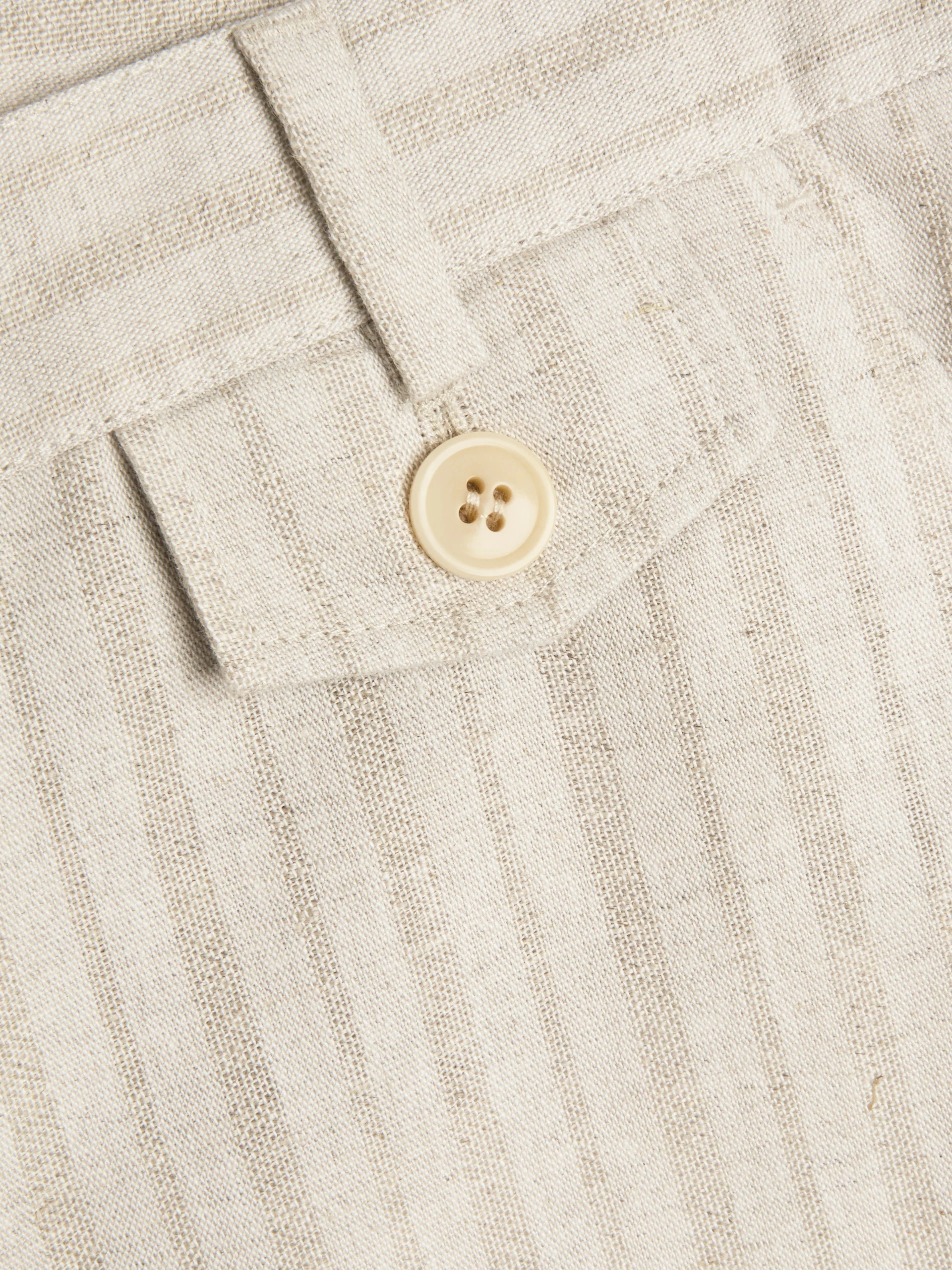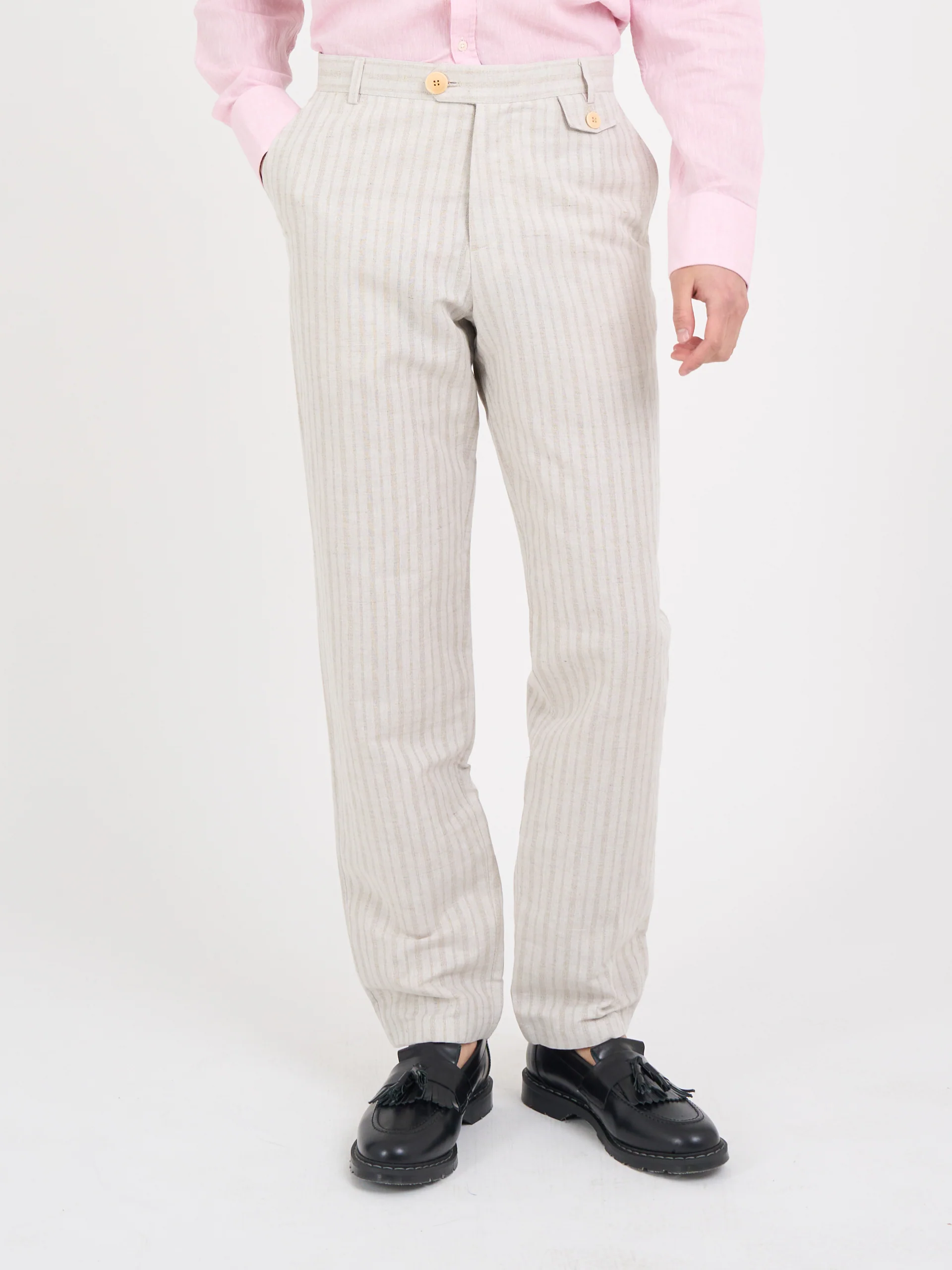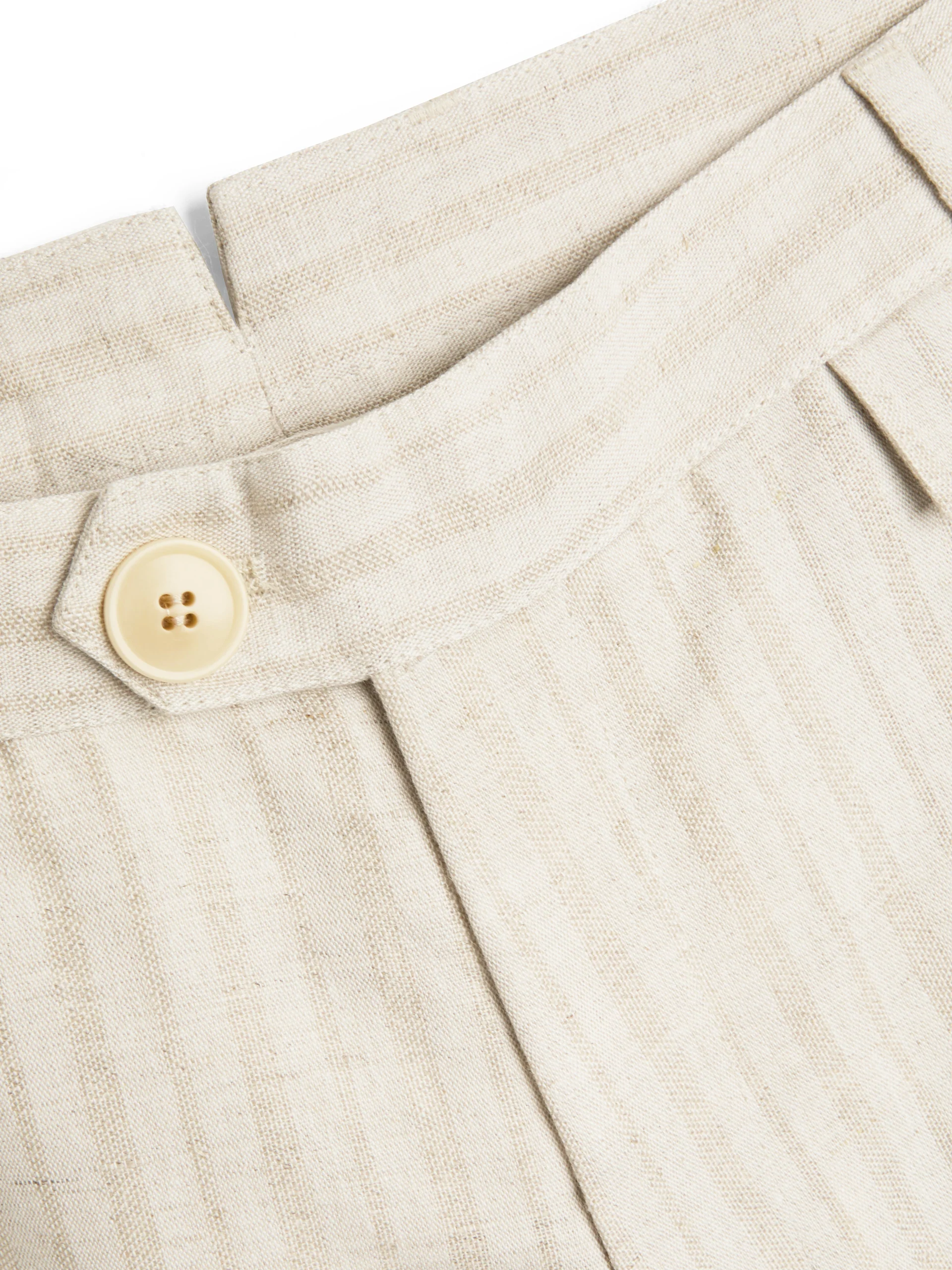 These trousers are so-called because of the v-shaped cut in the rear of the waistband, which is a reference to classic men's trousers that had room for buttons for braces. This style is crafted from a lightweight cotton-linen blend with a tonal stripe and can be worn.