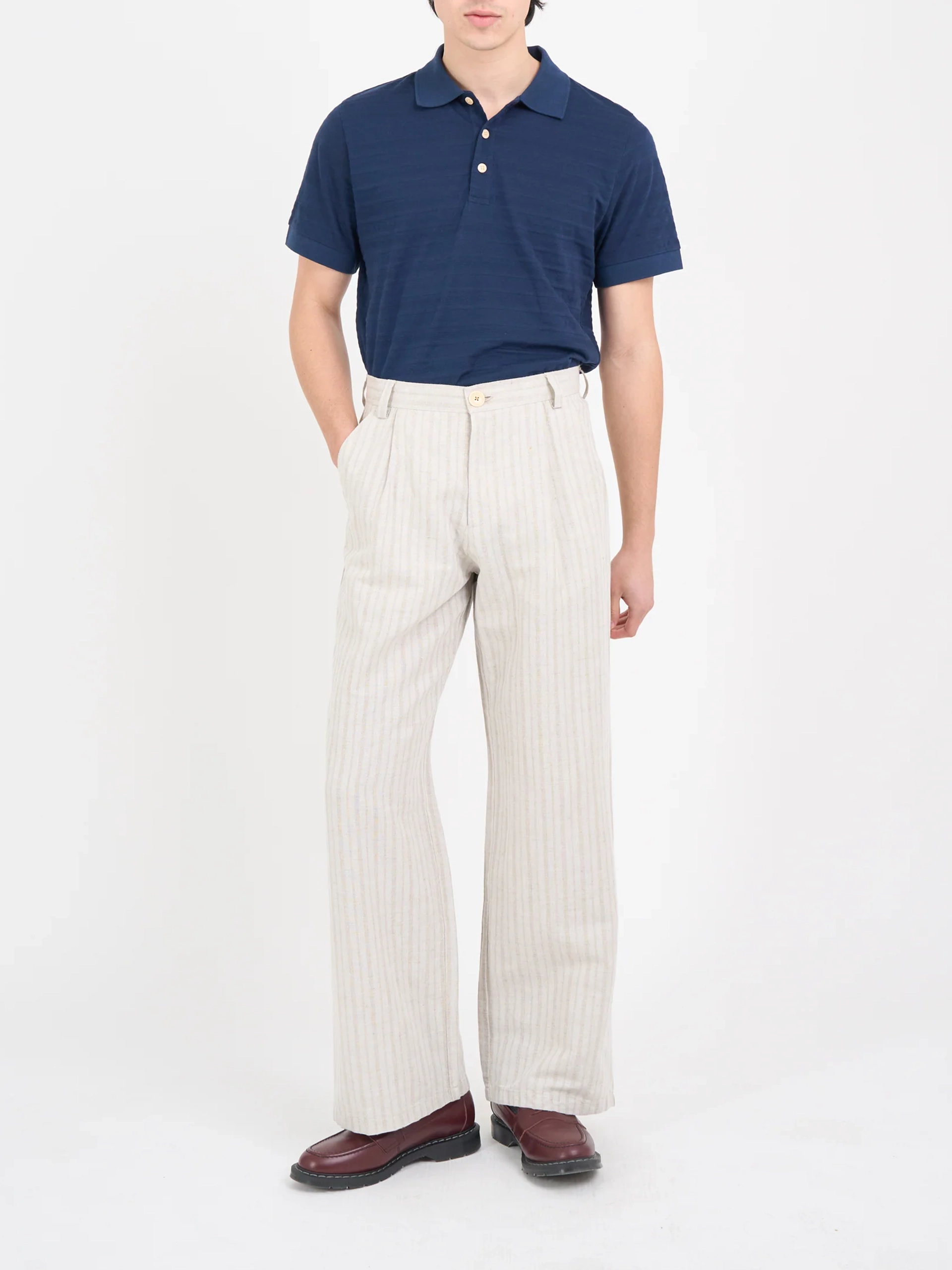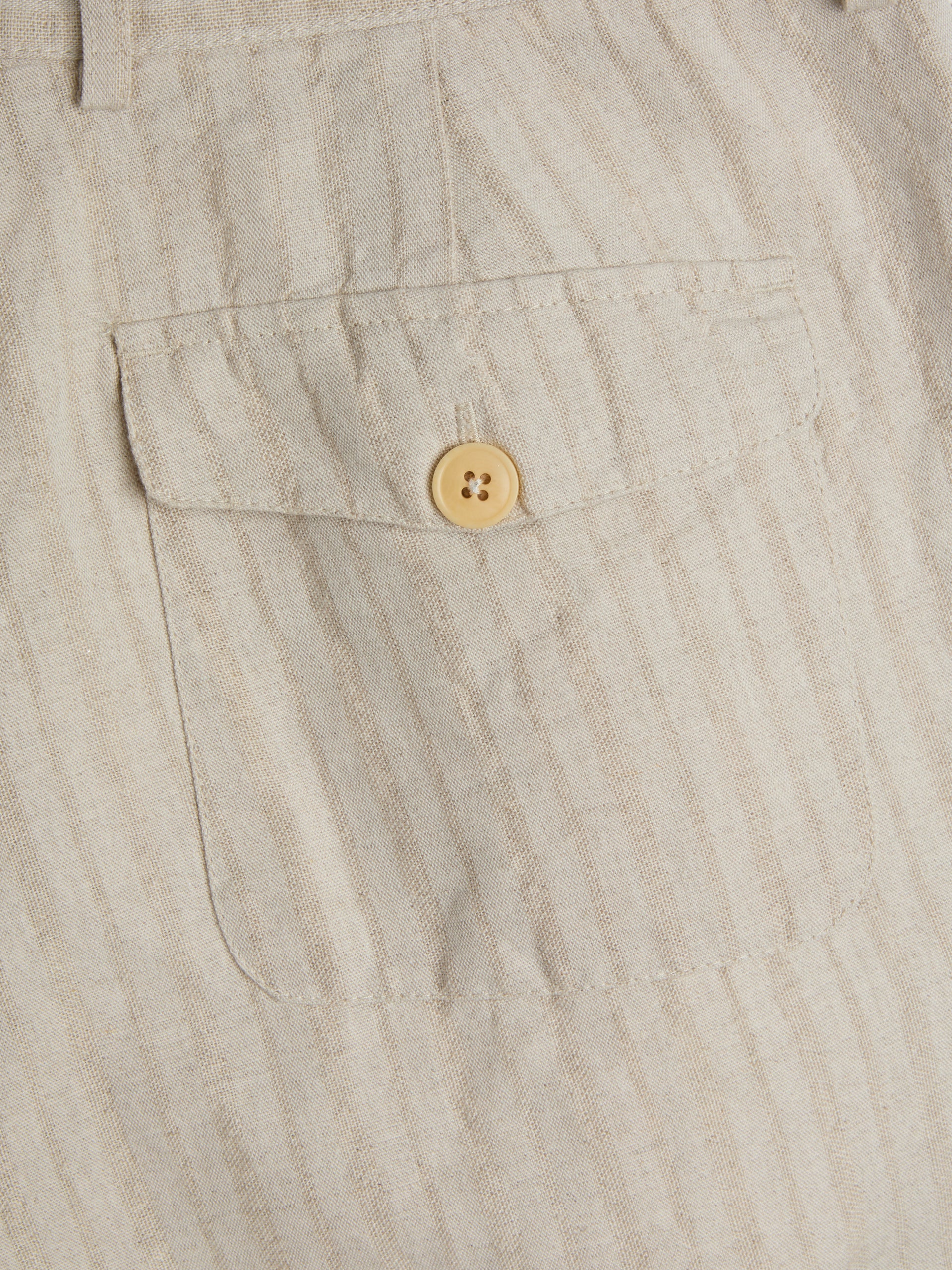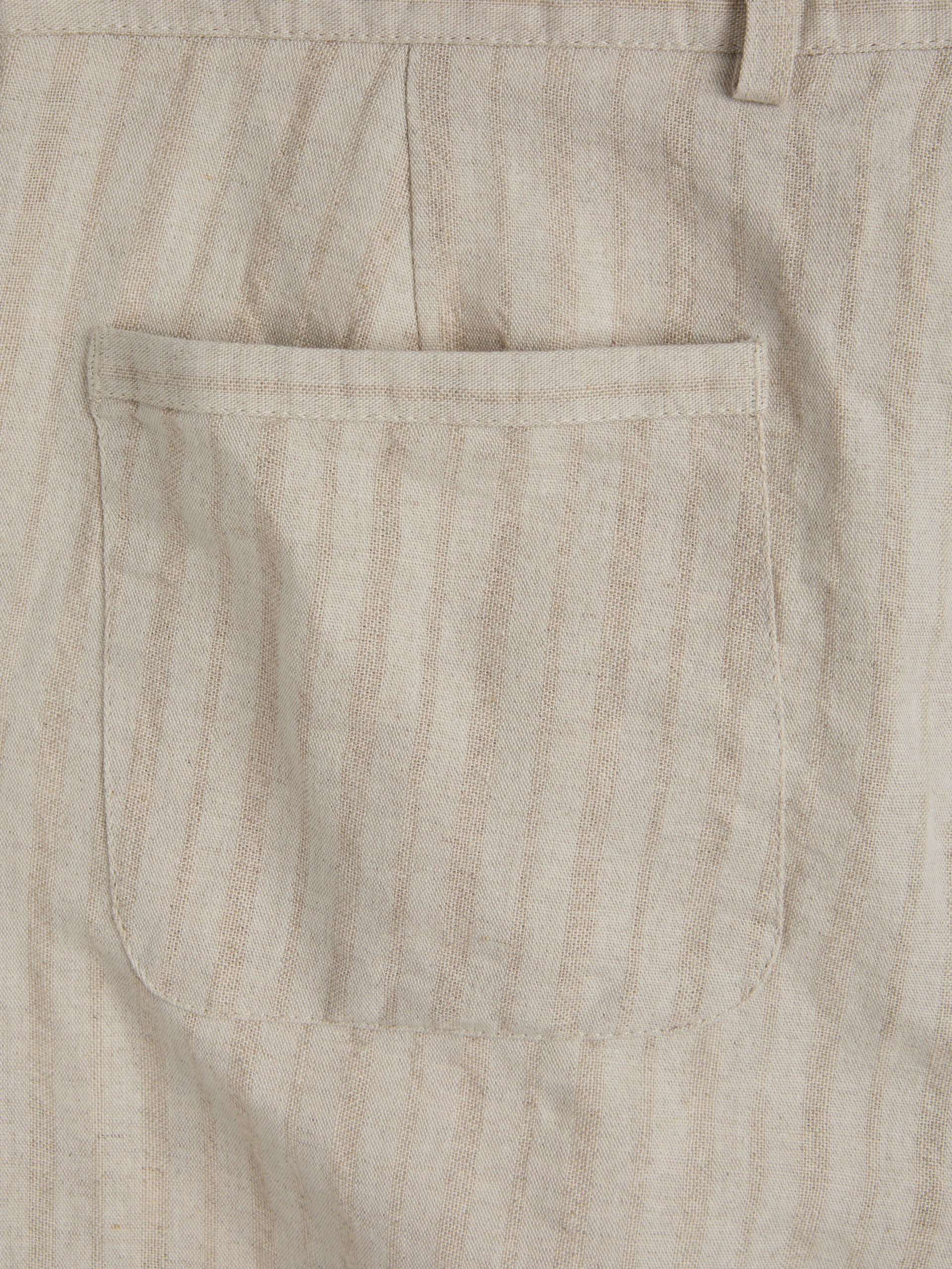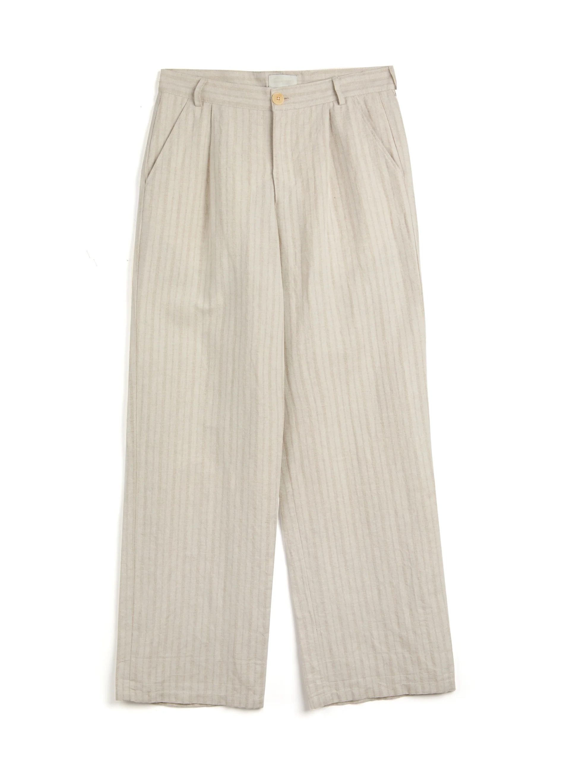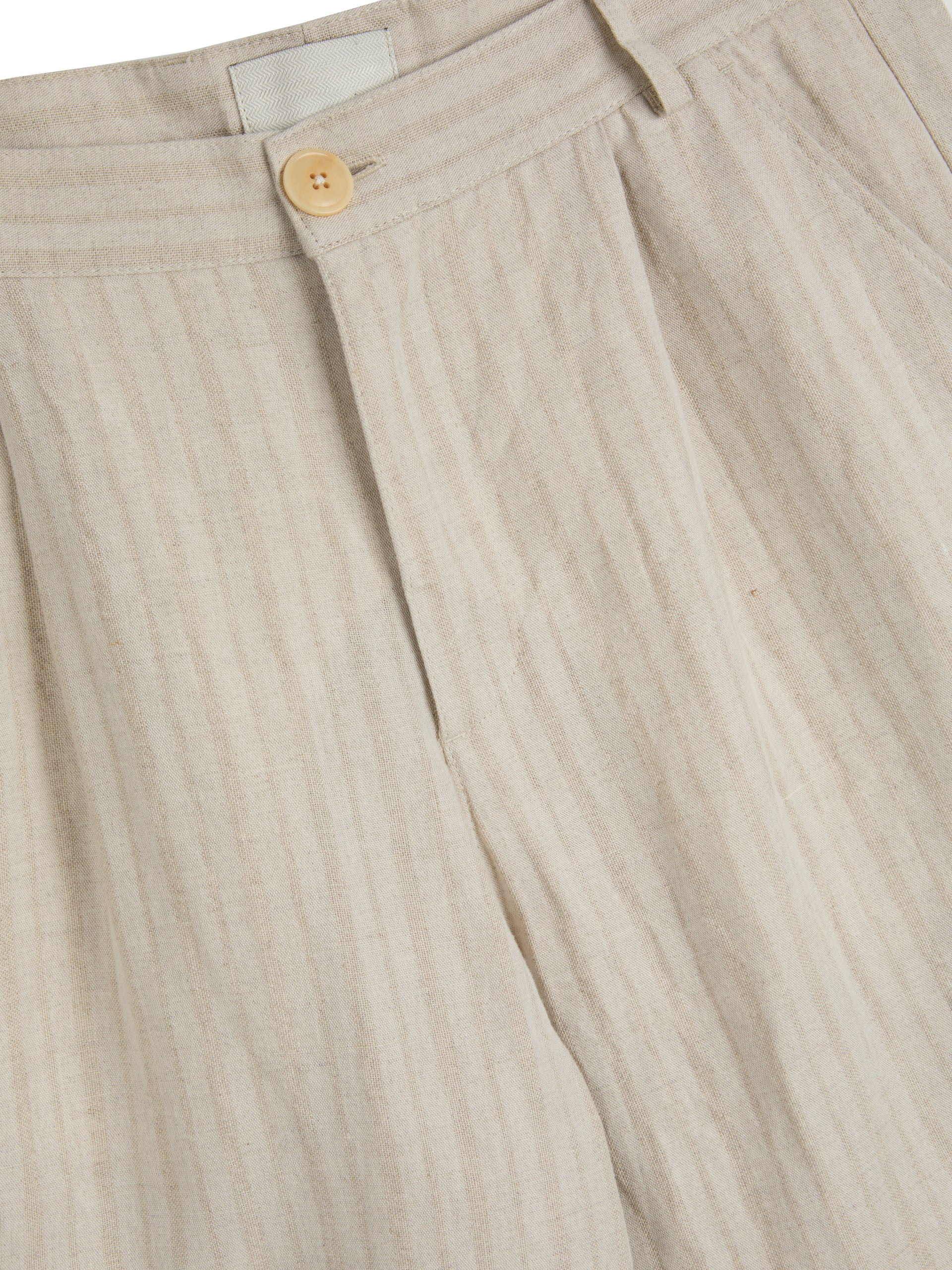 The trouser is a wide-leg style with single pleats for a contemporary silhouette. This iteration has been cut from a lightweight cotton and linen blend with a tonal stripe. Can be worn as separates or as part of a suit.