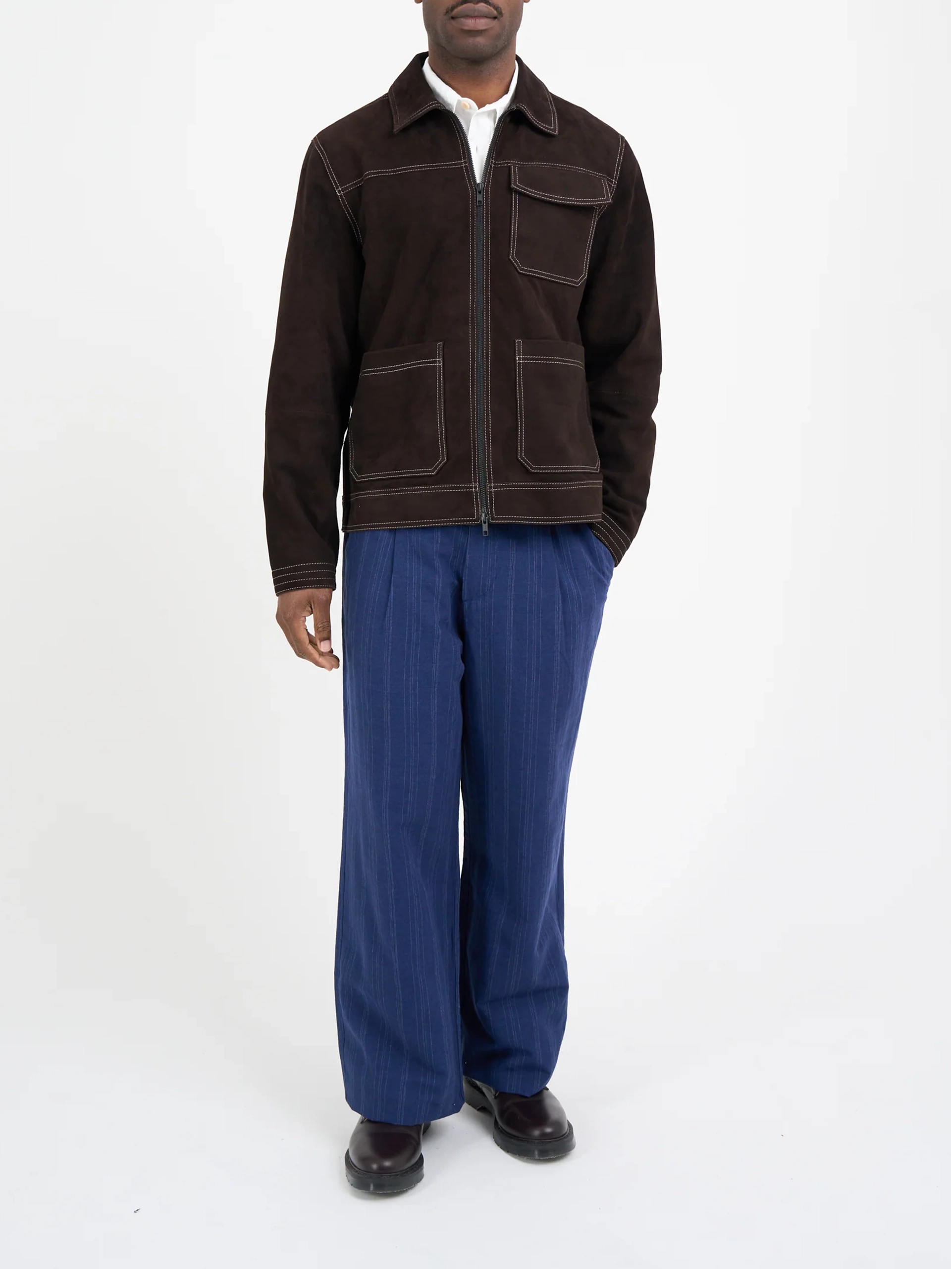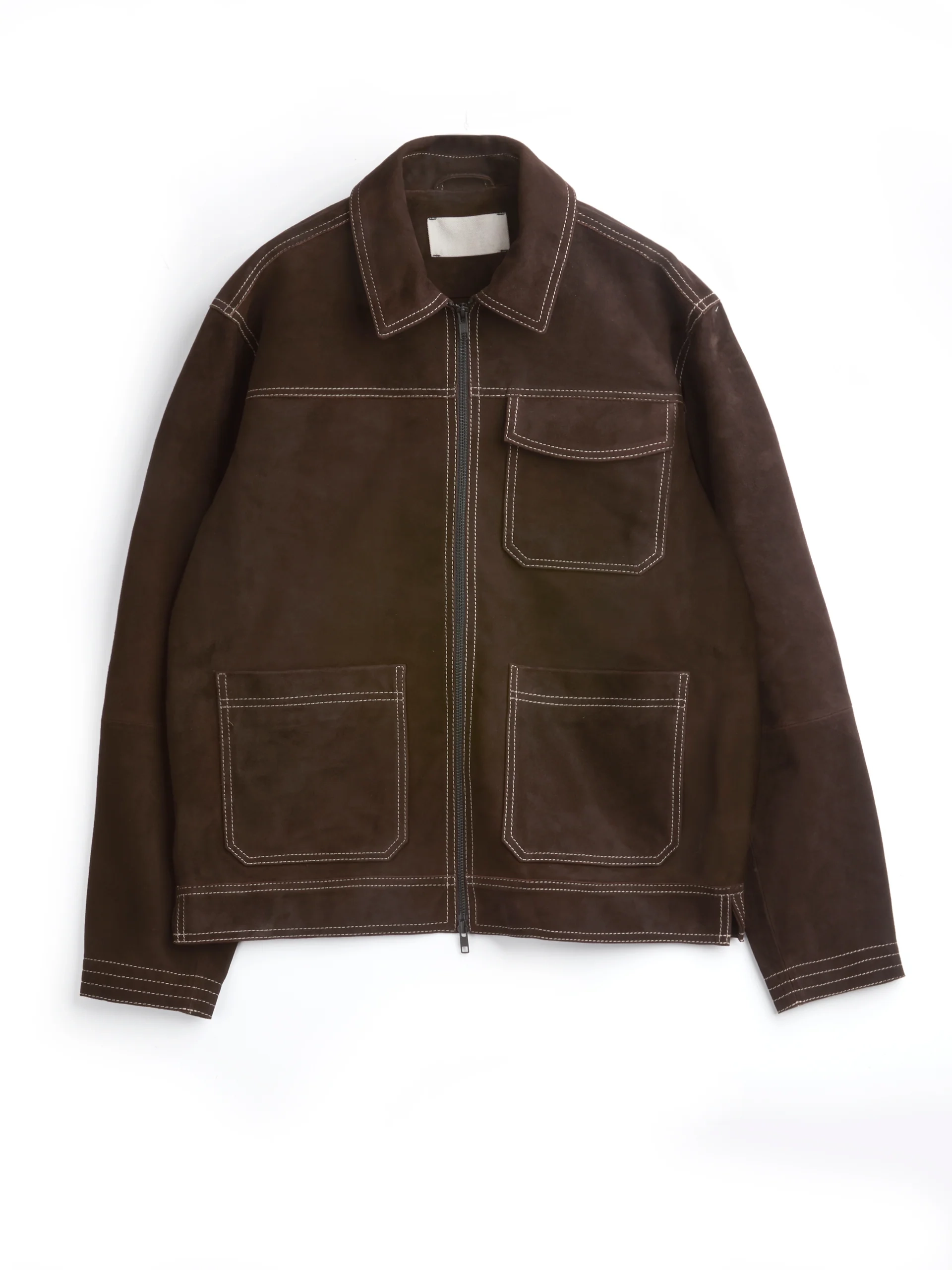The jacket is a brilliant new short chore jacket for the autumn season, crafted in a soft, heavyweight suede for a luxury rendition of the classic shape, and features two patch pockets with one flat chest pocket with contrast twin-needle stitch